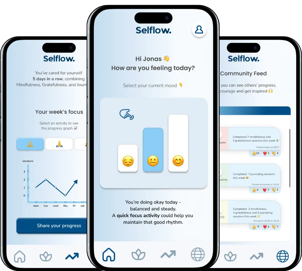 Selflow is a well-being app designed to help people slow down, reflect, and care for their mental health in a gentle and structured way. The app combines mindfulness, journaling, and gratitude practices into a calm daily routine that adapts to each user’s mood and progress. Its purpose is to make self-care feel natural and rewarding rather than forced or time-consuming.